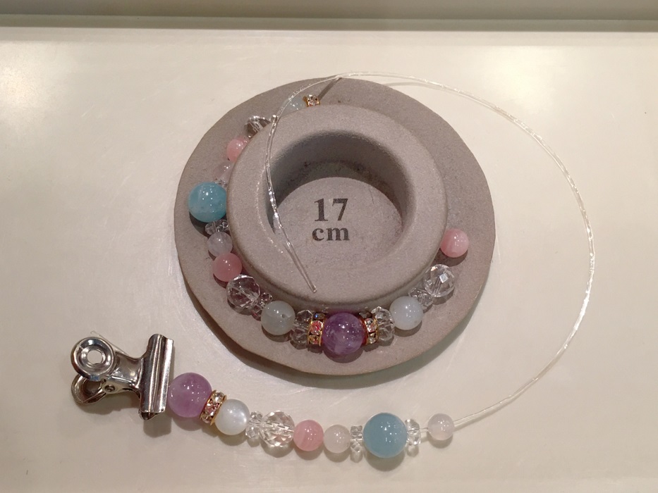 デザインが決まったら、中に通るブレスレット用のゴムにどんどんパーツを通していき……。
